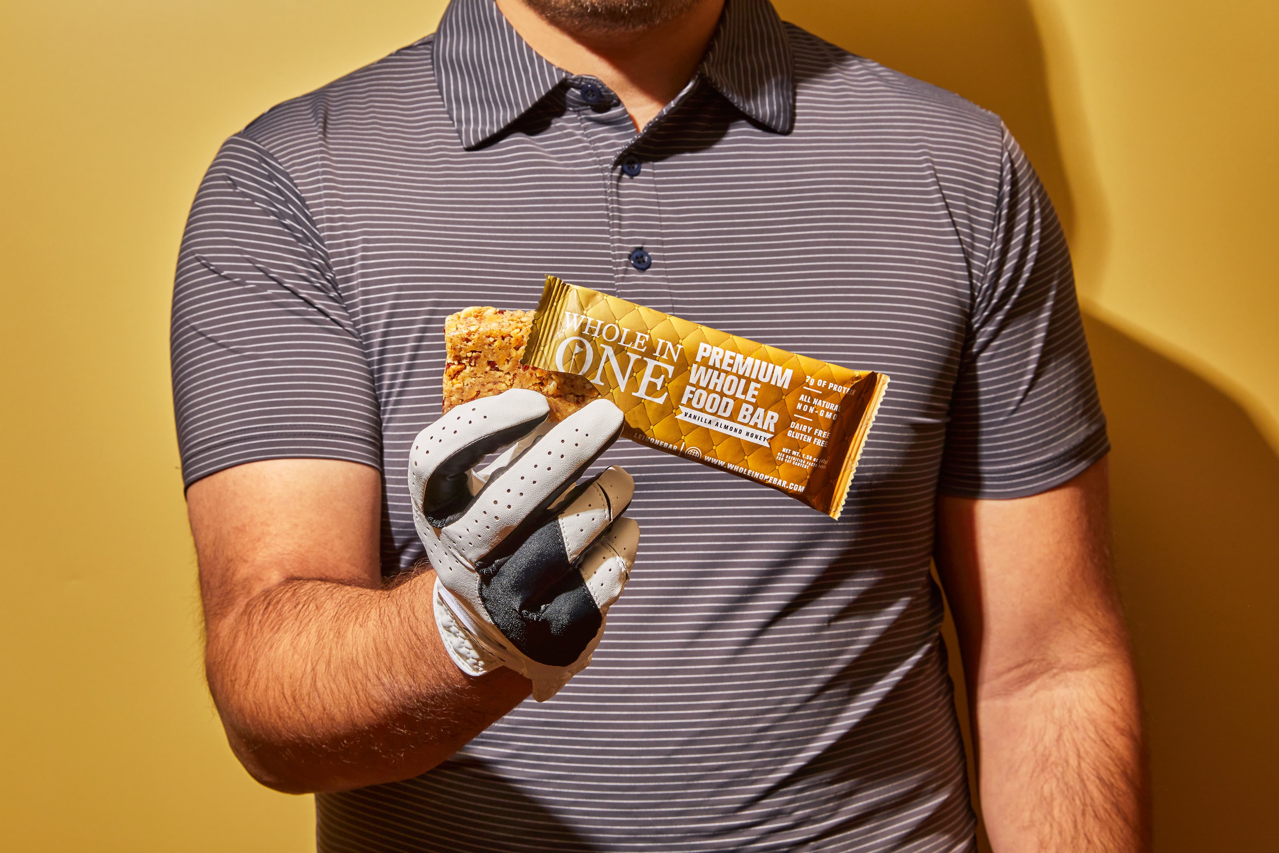 WHOLE IN ONE WAS DESIGNED BY OUR LEAD BRICKHOUSE NUTRITION PHYSICIAN (AN AVID GOLFER LIKE EVERY DOCTOR YOU KNOW) TO MAKE THE DECISION BETWEEN A HOT DOG OR A BAG OF CHIPS A BIT EASIER. NEXT TIME JUST GRAB YOURSELF A DELICIOUS, UNMELTABLE WHOLE IN ONE BAR THAT'S PACKED WITH REAL FOODS AND NUTRITION TO GET LOW ON THE BACK NINE.